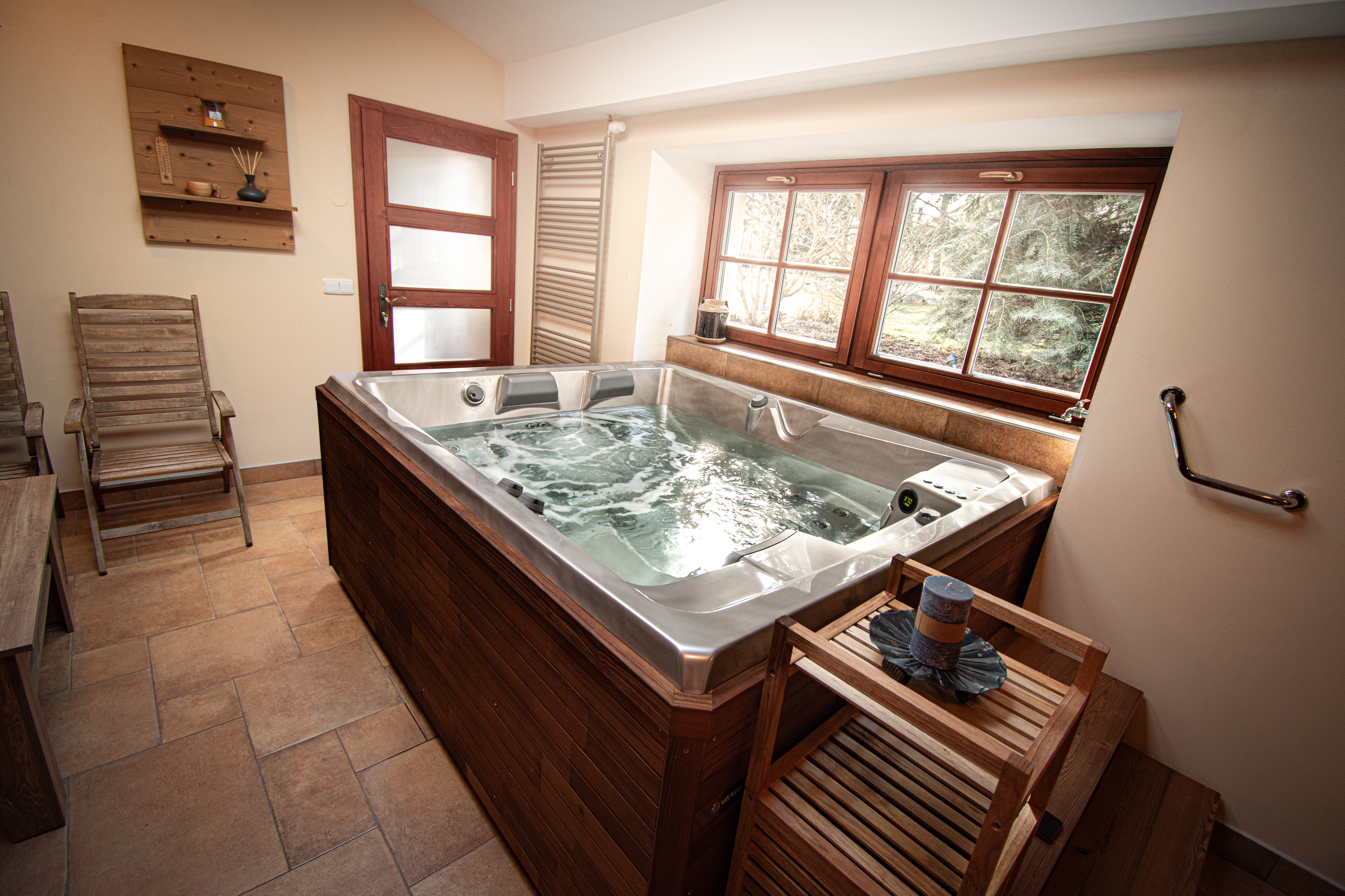 Whirlpool s panoramatickým výhledem do relaxační zahrady