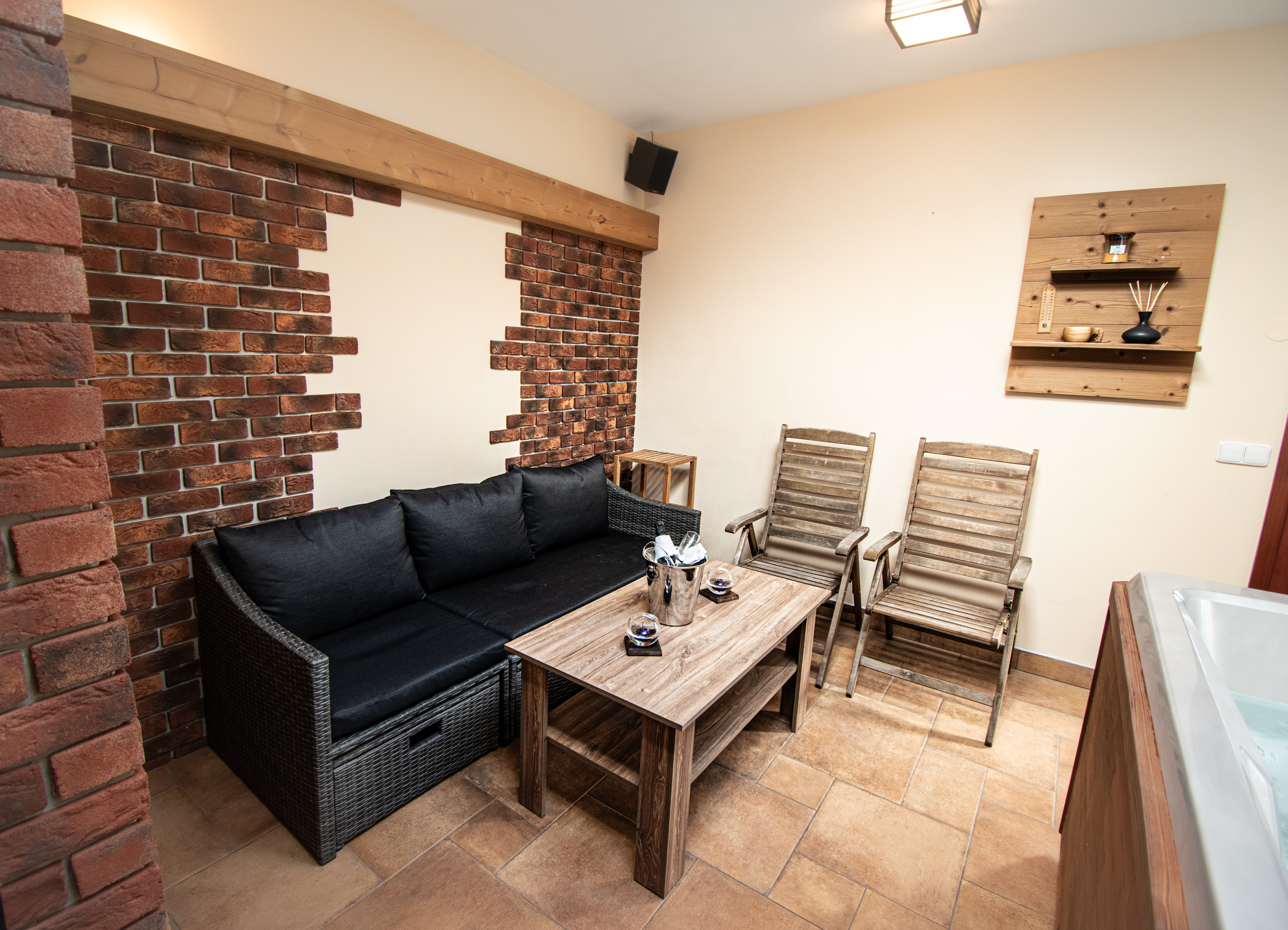 v rámci Vaší rekreace si dovolujeme pro zpříjemnění pobytu nabídnout službu privátního "wellness". Tento prostor byl zbudován jako odpověď na náročný životní styl pro všechny, kdo hledají příjemné místo k relaxaci a odpočinku. Jedna se tedy o skvělého společníka pro Vaši rodinu či partu přátel. Těšíme se na Vás.